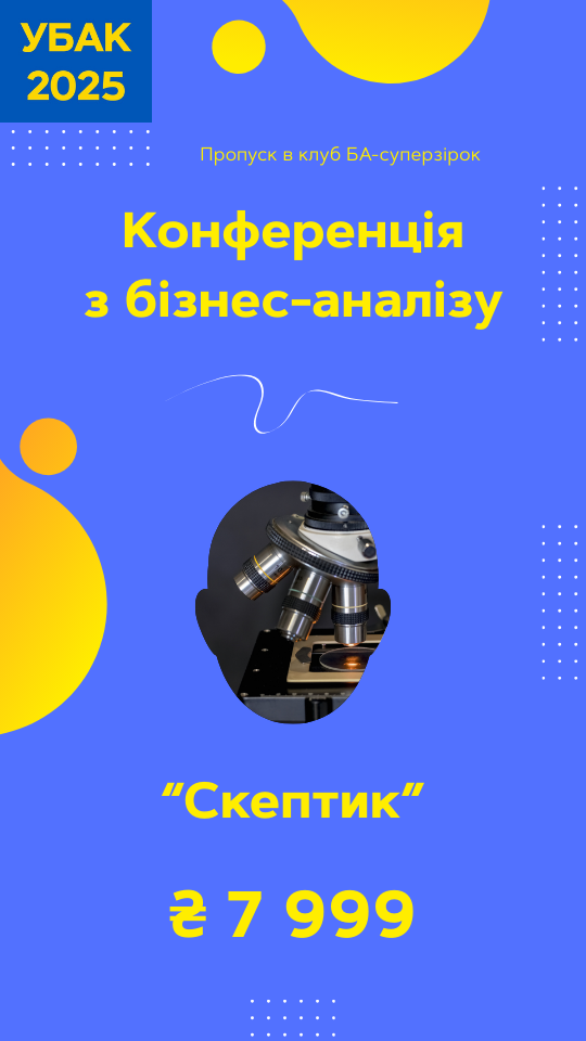 Цей квиток дає повний доступ до всіх сесій Української конференції з бізнес-аналізу, яка стартує 2 жовтня 2025 року.